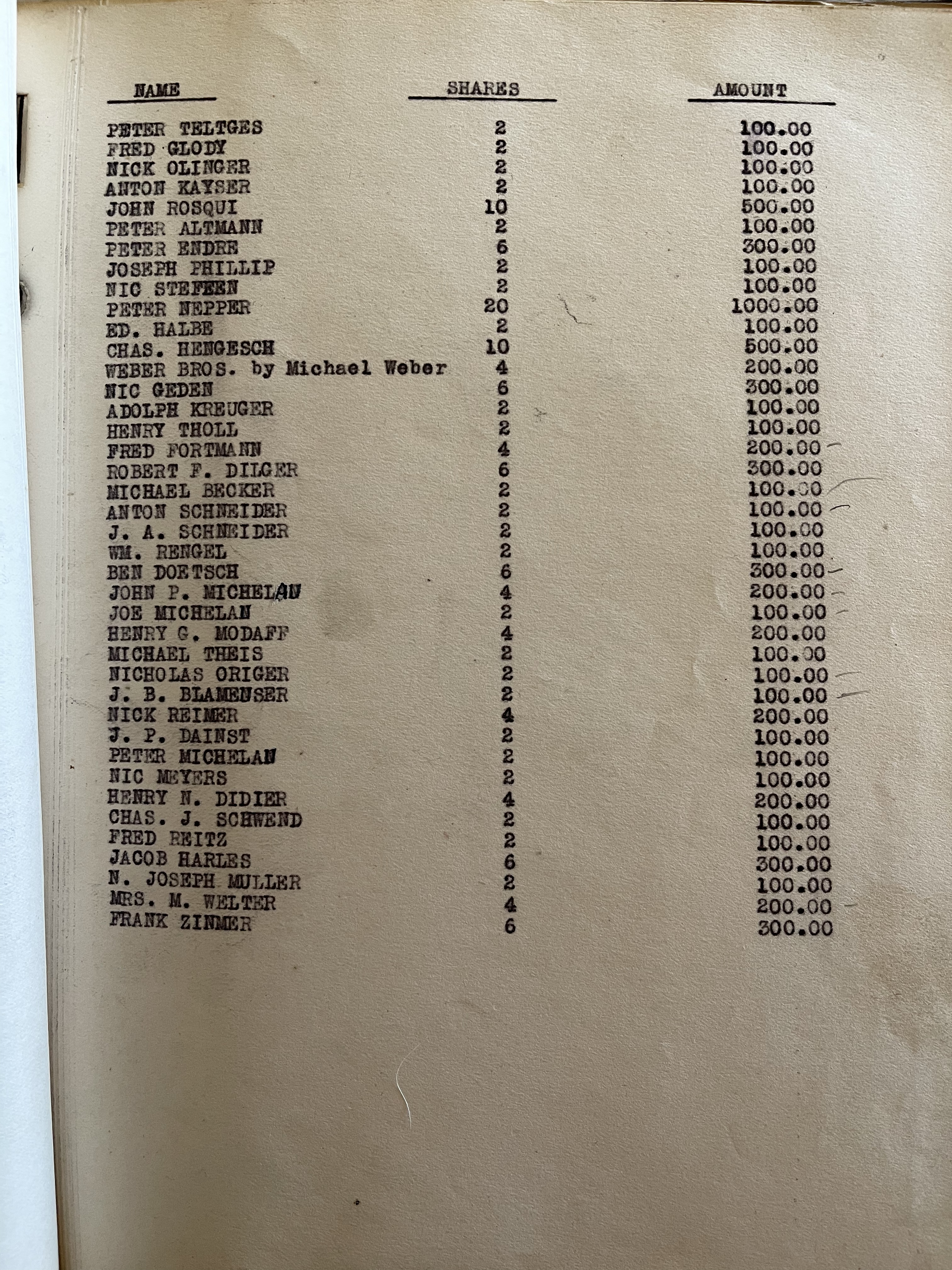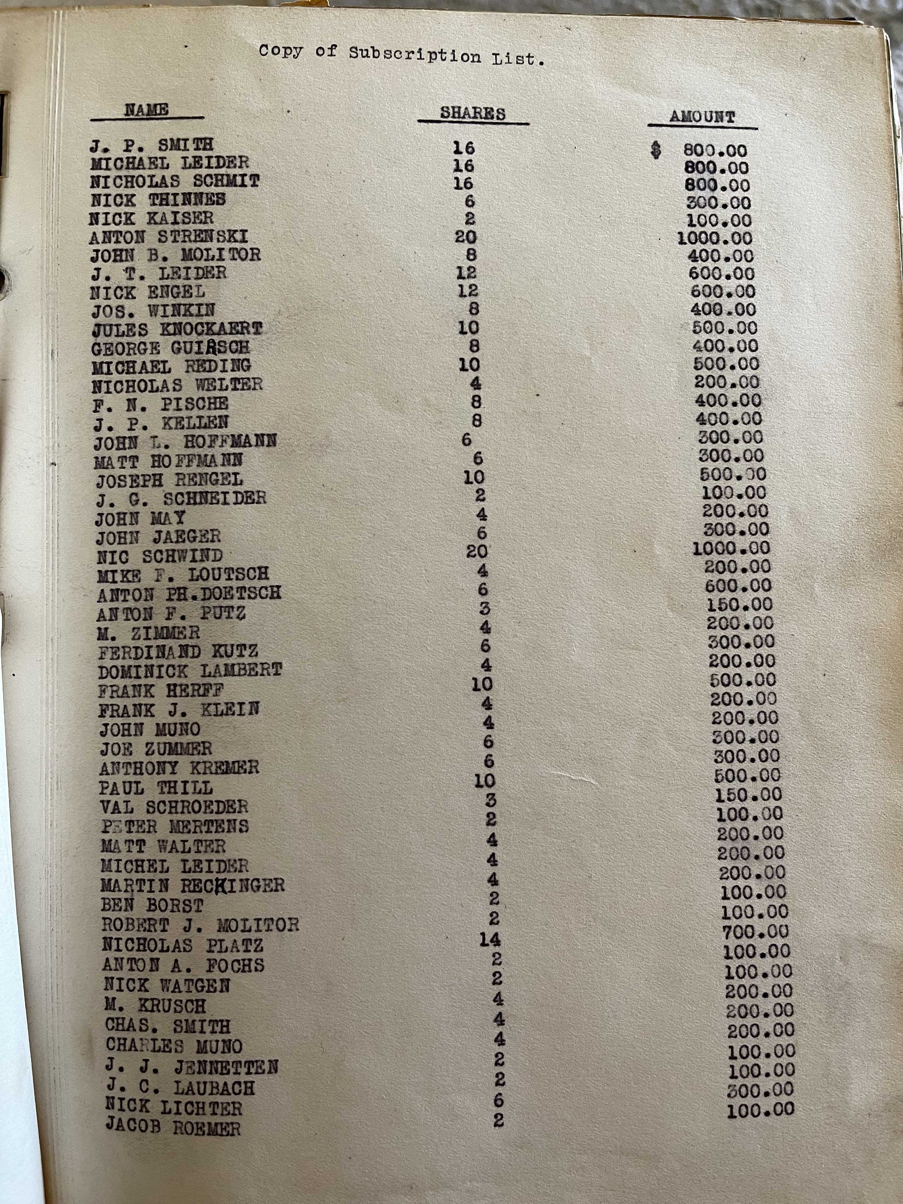 Present at this first director’s meeting were Ferdinand Kutz, Joseph Rengel, John P. Leider, Michael Leider, John C. Laubach, J. Philip Smith, John Molitor, Nicholas Schmidt, Nicholas Platz and Anton Kramer. J. P. Smith acted as chair of the meeting.