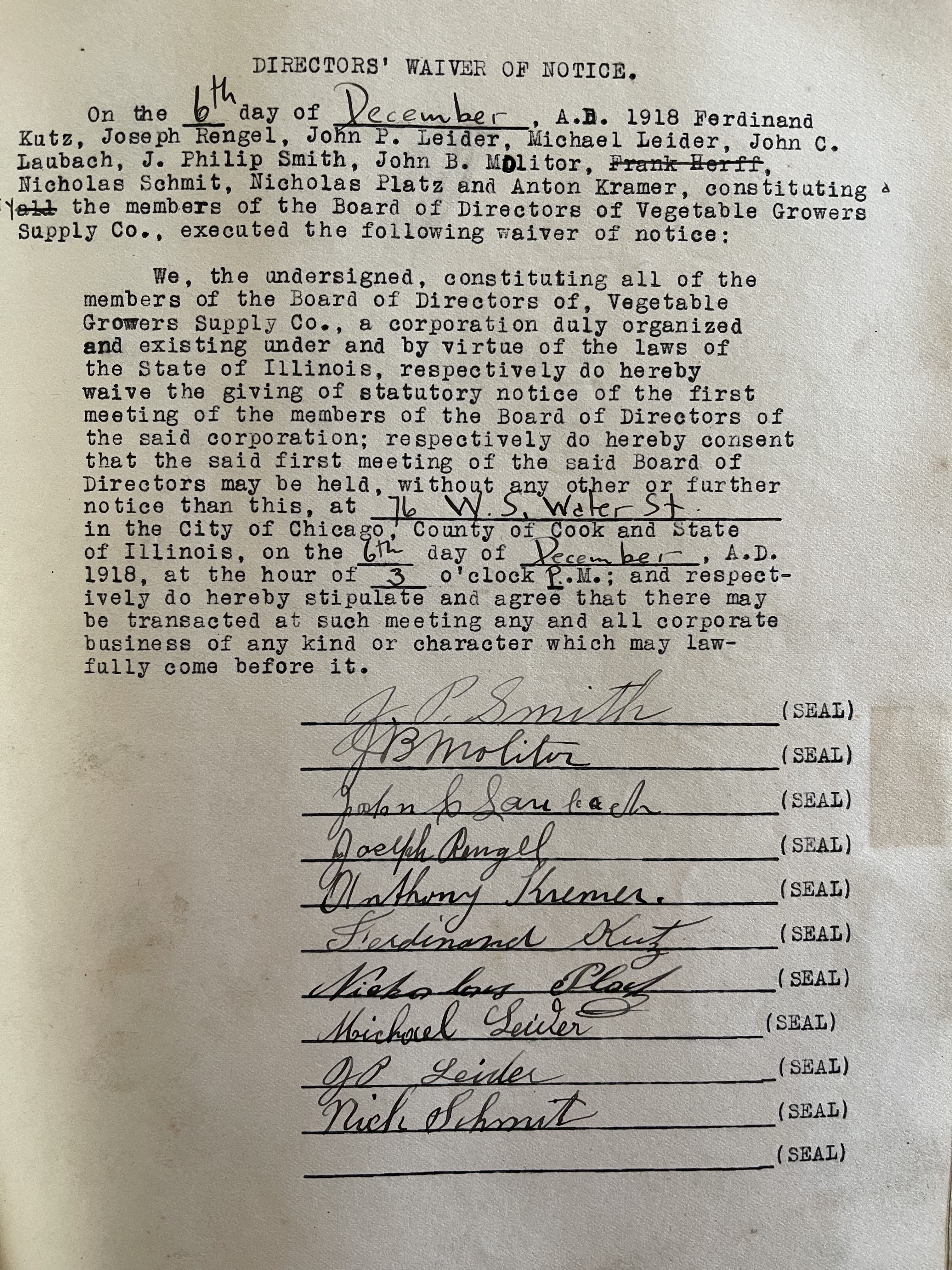 With this incorporation, one can infer that these truck farmers, who raised a substantial amount of money to capitalize this company, were concerned about two things: 1) creating a new and controlled source of supply to prevent price escalation of boxes and 2) be transparent about ownership and prevent any one truck farmer from dominating the stock ownership.